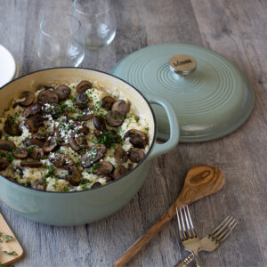 Овој сад за готвење е одличен избор за оние што сакаат комбинација од капацитет, издржливост и елегантен дизајн. Совршен е за семејни оброци, супи, печење месо и леб, подготовка на десерти.